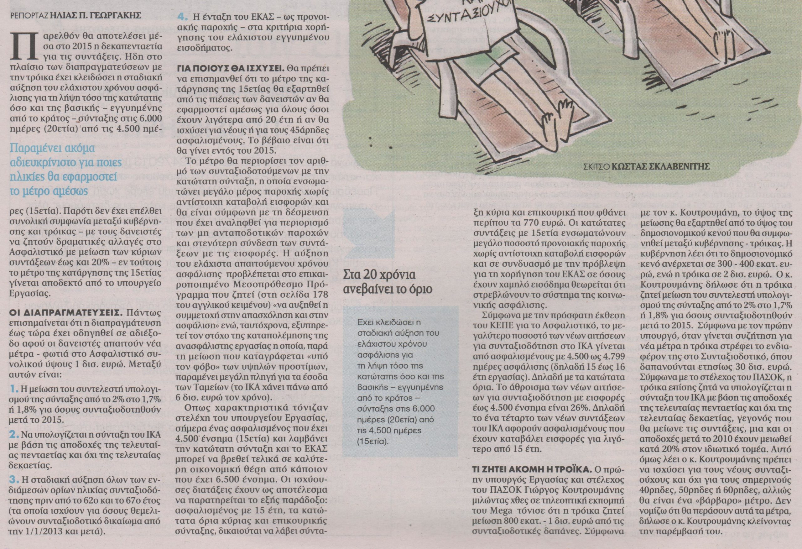Παρελθόν θα αποτελέσει μέσα στο 2015 η δεκαπενταετία για τις συντάξεις. Ήδη στο πλαίσιο των διαπραγματεύσεων με την τρόικα έχει κλειδώσει η σταδιακή αύξηση του ελάχιστου χρόνου ασφάλισης για τη λήψη τόσο της κατώτατης όσο και της βασικής –εγγυημένης από το κράτος- σύνταξης στις 6.000 ημέρες (20ετία) από τις 4.500 ημέρες (15ετία).
