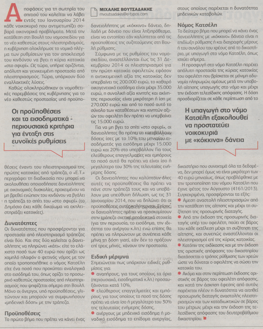 Αποφάσεις για τη σωτηρία του σπιτιού του καλείται να λάβει εντός του Ιανουαρίου 2014 κάθε νοικοκυριό που αντιμετωπίζει σοβαρά οικονομικά προβλήματα. Μετά την κατάθεση στη Βουλή του νομοσχεδίου για το νέο καθεστώς στους πλειστηριασμούς, η κυβέρνηση ολοκλήρωσε το νομικό πλέγμα των ρυθμίσεων για τον αποκλεισμό του κινδύνου να βγει η κύρια κατοικία «στο σφυρί».