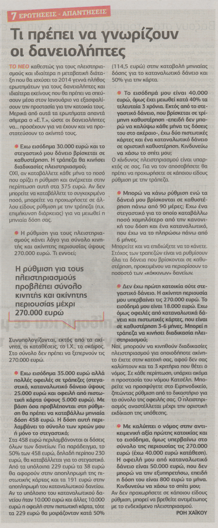 Καθώς ολοκληρώθηκαν οι νομοθετικές παρεμβάσεις της κυβέρνησης για το νέο καθεστώς προστασίας υπό προϋποθέσεις έναντι του πλειστηριασμού της πρώτης κατοικίας από τράπεζα, περιγράφεται στο δημοσίευμα του Ελεύθερου Τύπου, η διαδικασία που μπορεί να ακολουθήσει οποιοσδήποτε δανειολήπτης με οικονομικές δυσκολίες, προκειμένου να μη βρεθεί ενώπιον του κινδύνου να βγάλει η τράπεζα το σπίτι του «στο σφυρί» (το Δημόσιο έχει κάθε δικαίωμα να εκπλειστηριάζει κατοικίες).