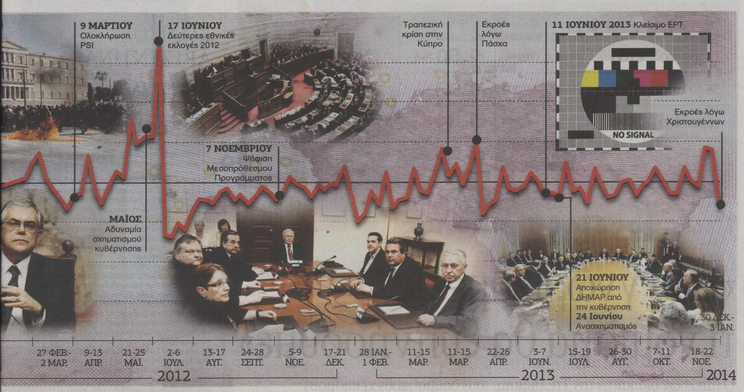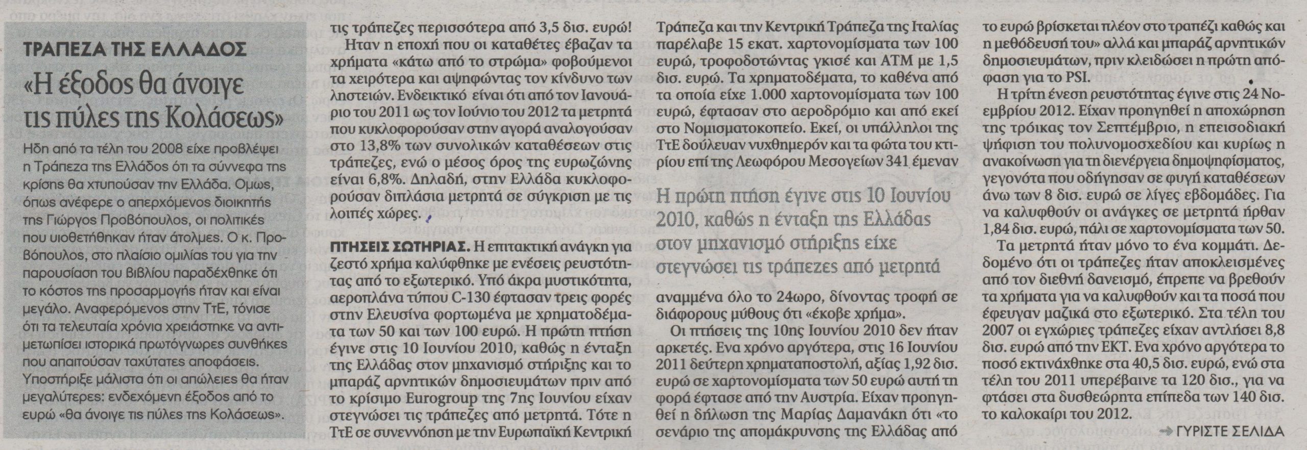 Δεν πρόκειται για σκηνές από χολιγουντιανή ταινία αλλά για πραγματικά γεγονότα στην Ελλάδα της κρίσης από το 2010 έως και το καλοκαίρι του 2012, όπως τα περιγράφει η ίδια η Τράπεζα της Ελλάδος. Οικονομικά δεδομένα και στοιχεία που πρώτη φορά βλέπουν επίσημα το φως της δημοσιότητας, αποδεικνύουν με τον πιο δραματικό τρόπο πόσο κοντά βρέθηκε η χώρα στο «ατύχημα» που θα μπορούσε να προκαλέσει ανεξέλεγκτη χρεωκοπία, τραπεζικό κραχ και αποπομπή από την Ευρωζώνη. Στο βιβλίο της με τον τίτλο «Το χρονικό της μεγάλης κρίσης» που παρουσίασε χθες, η Τράπεζα της Ελλάδος περιγράφει ημέρα με την ημέρα από το 2008 έως και τα τέλη του 2013 το θρίλερ που βίωσε η χώρα.