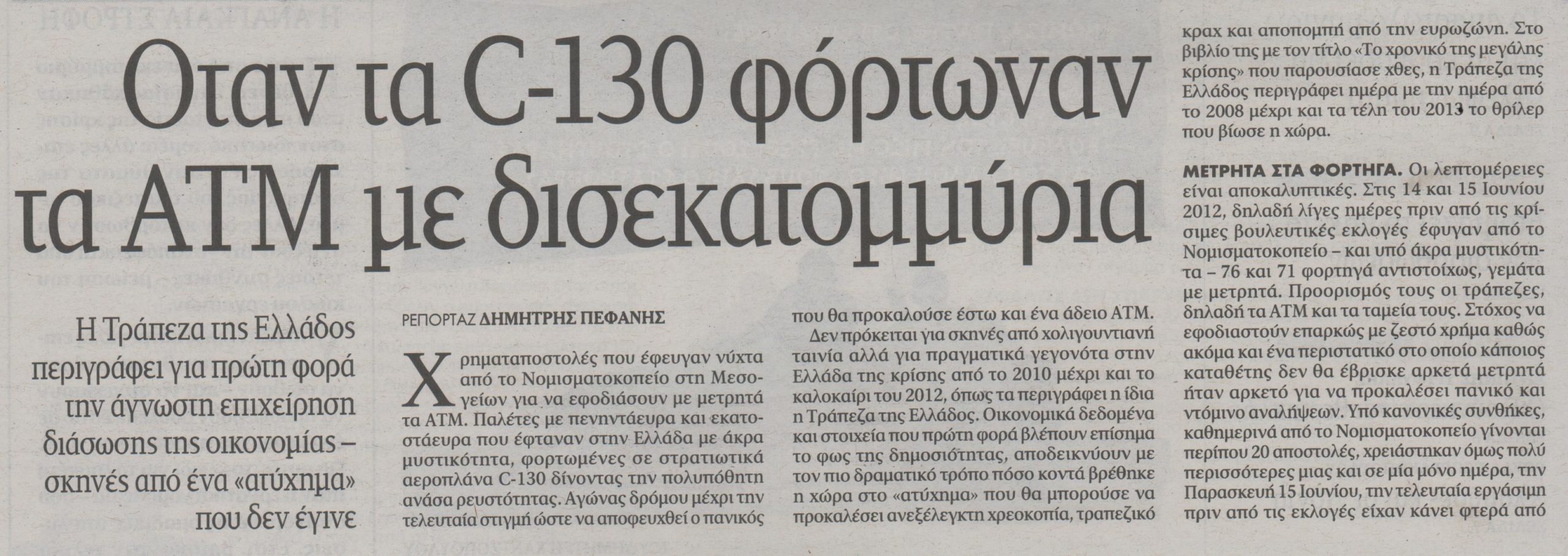Χρηματαποστολές που έφευγαν νύχτα από το Νομισματοκοπείο στη Μεσογείων για να εφοδιάσουν με μετρητά τα ΑΤΜ. Παλέτες με πενηντάευρα και εκατοστάευρα που έφταναν στην Ελλάδα με άκρα μυστικότητα, φορτωμένες σε στρατιωτικά αεροπλάνα C-130 δίνοντας την πολυπόθητη ανάσα ρευστότητας. Αγώνας δρόμου έως την τελευταία στιγμή ώστε να αποφευχθεί ο πανικός που θα προκαλούσε έστω και ένα άδειο ΑΤΜ.