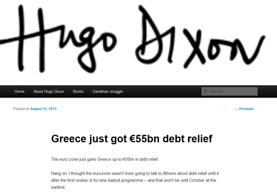 Ο Ούγκο Ντίξον υποστηρίζει ότι η Ελλάδα έχει ήδη λάβει ελάφρυνση του νέου δανείου των 86 δισ. ευρώ που θα αποπληρωθεί σε 32,5 έτη, με επιτόκιο 1%.
