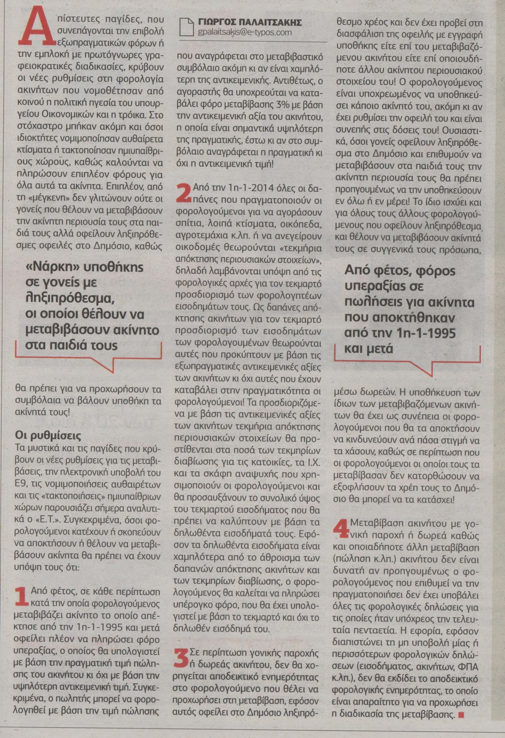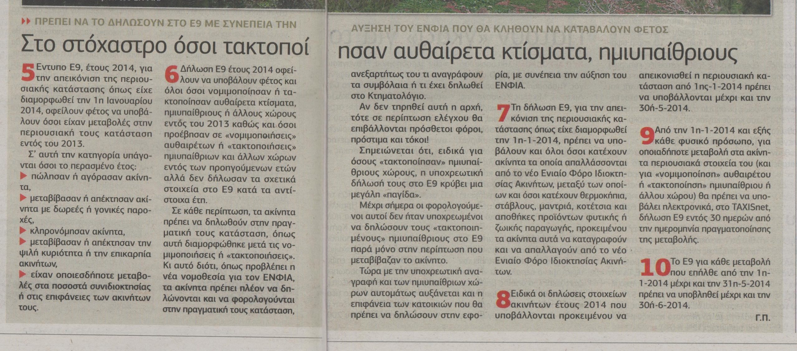 Τα μυστικά και τις παγίδες που κρύβουν οι νέες ρυθμίσεις για τις μεταβιβάσεις, την ηλεκτρονική υποβολή του Ε9, τις νομιμοποιήσεις αυθαιρέτων και τις «τακτοποιήσεις» ημιπαίθριων χώρων παρουσιάζει σήμερα αναλυτικά ο Ελεύθερος Τύπος.