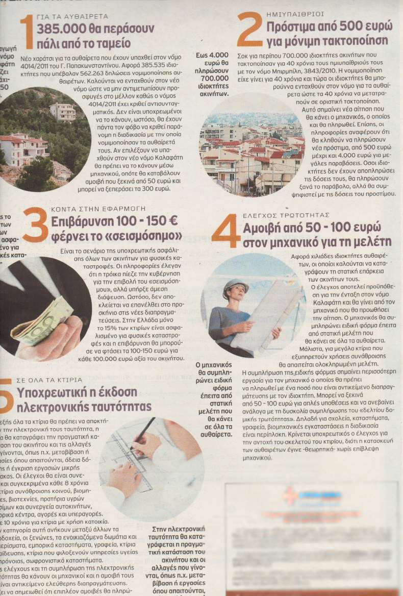 Ακόμη, ως χαράτσι μπορεί να εκληφθεί ο έλεγχος τρωτότητας εκατοντάδων χιλιάδων αυθαιρέτων κτιρίων καθώς και η αμοιβή στους μηχανικούς για τη δημιουργία της ηλεκτρονικής ταυτότητας.