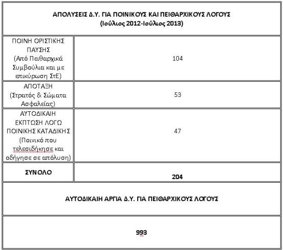 Σύμφωνα με τα στοιχεία που έδωσε στη δημοσιότητα το υπουργείο, μόνο τον τελευταίο μήνα απολύθηκαν για σοβαρούς ποινικούς και πειθαρχικούς λόγους 104 δημόσιοι υπάλληλοι ανεβάζοντας το συνολικό αριθμό από τον Ιούλιο του 2012 σε 204, ενώ οι υπάλληλοι που έχουν τεθεί σε αυτοδίκαιη αργία το ίδιο χρονικό διάστημα (Ιούλιος 2012 – Ιούλιος 2013) ανέρχεται σε 993.