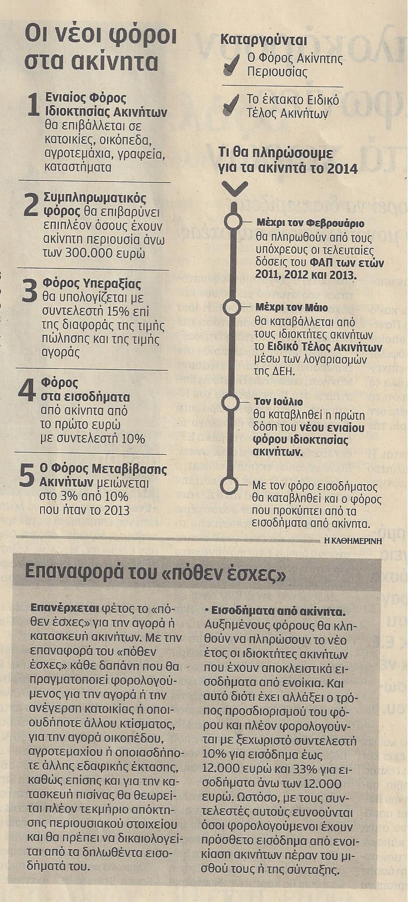 Σύμφωνα με τον προϋπολογισμό, οι φόροι ανέρχονται στα 3,9 δισ. ευρώ από 2,78 δισ. ευρώ το 2013. Το 2014 όλοι οι ιδιοκτήτες θα πληρώσουν τον ενιαίο φόρο ακινήτων, επανέρχεται το «πόθεν έσχες» για την αγορά ή κατασκευή κατοικίων, ενώ επιβάλλεται φόρος υπεραξίας στις μεταβιβάσεις.