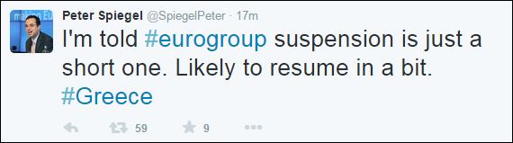 “Μου είπαν ότι πρόκειται για μικρής διάρκειας διακοπή του Eurogroup. Πιθανόν να συνεχιστεί σε λίγο”, έγραψε ο δημοσιογράφος των FT Peter Spiegel στο Twitter.