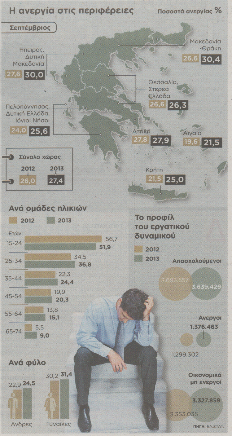 Οι αριθμοί είναι εφιαλτικοί, ιδιαίτερα όταν αφορούν ανθρώπους και ανεργία. Τόσο τα στοιχεία της ΕΛ.ΣΤΑΤ. όσο και του ΟΑΕΔ είναι αμείλικτα, αντικατοπτρίζοντας το αδιέξοδο για εκατομμύρια Έλληνες και αποδεικνύοντας ότι οι όποιες αποσπασματικές προσπάθειες του υπουργείου Εργασίας δεν είναι ικανές να αναστρέψουν τις επιπτώσεις της ύφεσης. Η μάστιγα της ανεργίας εξακολουθεί να πλήττει κυρίως τους νέους, με έναν στους δύο να βρίσκεται εκτός αγοράς εργασίας.
