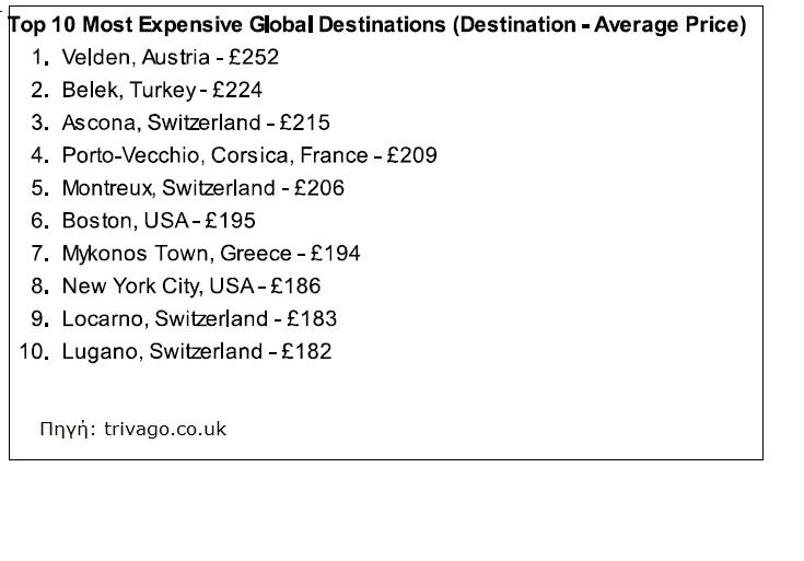 Στην κορυφή της κατάταξης βρίσκεται το Βελντέν της Αυστρίας με μέση τιμή δωματίων 252 στερλίνες (316,7 ευρώ). Το Μπελέκ της Τουρκίας καταλαμβάνει τη δεύτερη θέση (224 στερλίνες ή 281,5 ευρώ) και η Ασκόνα της Ελβετίας την Τρίτη (215 στερλίνες ή 270 ευρώ).