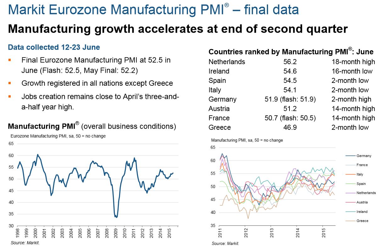 Σύμφωνα με τα τελικά στοιχεία που ανακοίνωσε η Markit για τον Ιούνιο, ο δείκτης υπεύθυνων προμηθειών (PMI) για τον τομέα μεταποίησης διαμορφώθηκε τον περασμένο μήνα σε υψηλό 14 μηνών στις 52,5 μονάδες, από το 52,2 του Μαΐου.