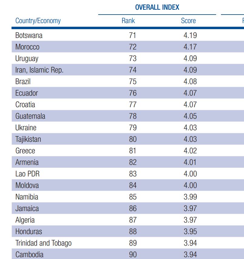 Παραμένει σταθερή στην 81η θέση της παγκόσμιας κατάταξης για την ανταγωνιστικότητα και κατατάσσεται χαμηλότερα από χώρες όπως η Ρουάντα (58η από 62η πέρυσι), η Μποτσουάνα (71η από 74η πέρυσι) αλλά και το Τατζικιστάν (80η από 91η πέρυσι).