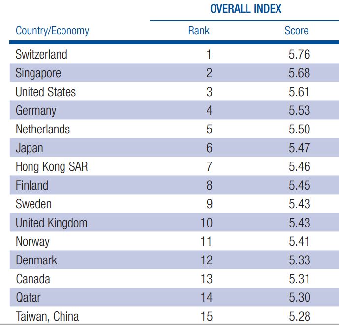 Στην κορυφή της λίστας βρίσκεται η Ελβετία για έβδομη συνεχή χρονιά, με την Σιγκαπούρη και τις ΗΠΑ να ακολουθούν στη δεύτερη και τρίτη θέση. Στην Ευρώπη, η Ισπανία, η Ιταλία, η Πορτογαλία και η Γαλλία έχουν καταγράψει σημαντική πρόοδο στην ενίσχυση της ανταγωνιστικότητας, σημειώνει η έκθεση του Παγκόσμιου Οικονομικού Φόρουμ.