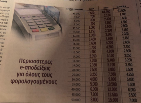 Από την Πρωτοχρονιά όλα αλλάζουν, καθώς οι e-δαπάνες αποσυνδέονται από το αφορολόγητο και στο κυνήγι τους μπαίνουν όλοι οι φορολογούμενοι, αφού όλα τα εισοδήματα, απ’ όλες τις πηγές, θα προστίθενται και το 30% του συνολικού εισοδήματος θα πρέπει να καλύπτεται από ηλεκτρονικές πληρωμές.Σημειώνεται ότι η λίστα με τις e – αποδείξεις περιλαμβάνει σχεδόν τα πάντα. Από τα είδη του σούπερ μάρκετ, τους λογαριασμούς για ηλεκτρικό ρεύμα, ύδρευση, σταθερή και κινητή τηλεφωνία, καύσιμα, πετρέλαιο θέρμανσης, κοινόχρηστα, ασφάλιστρα αυτοκινήτου, επισκευές κατοικιών, ανταλλακτικά αυτοκινήτων.