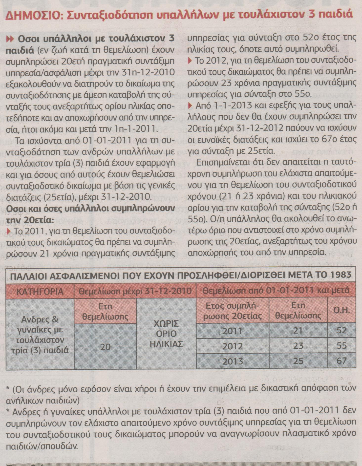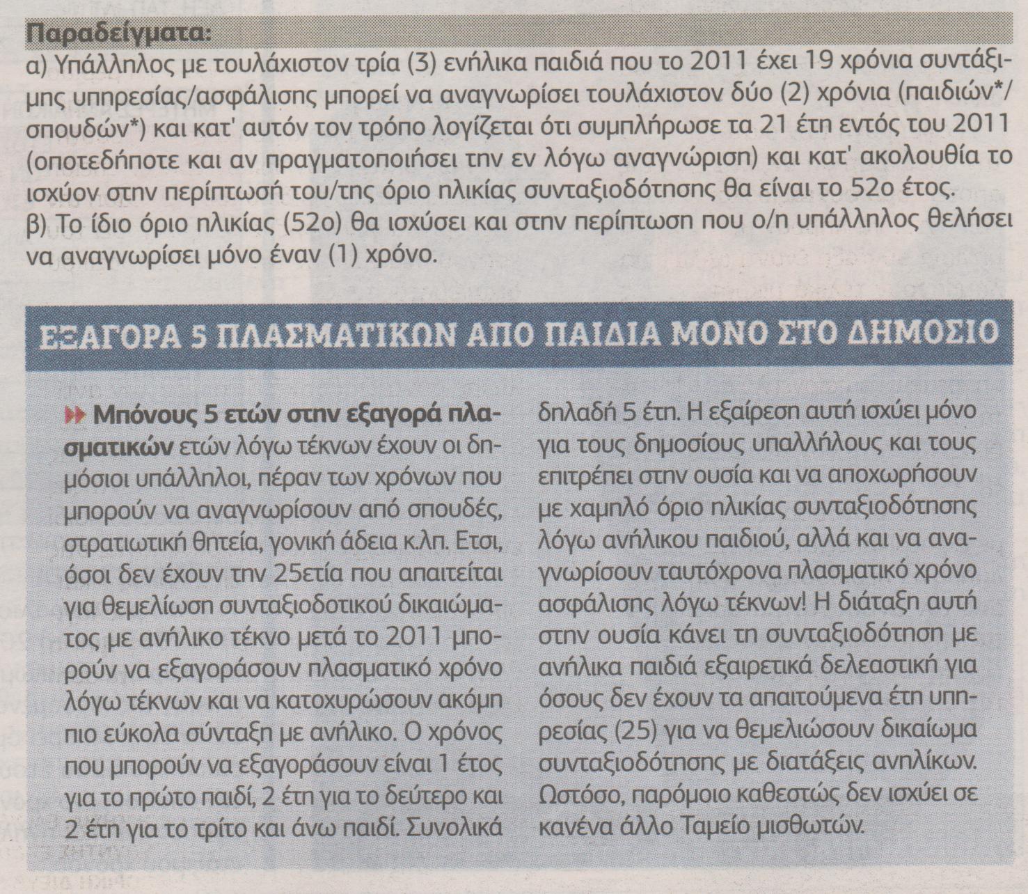 Το κέρδος για τους γονείς είναι διπλό, αφενός γιατί μπορούν να κατοχυρώσουν τις ευνοϊκές προϋποθέσεις συνταξιοδότησης, δηλαδή αποχώρηση από τα 50 και αφετέρου να φύγουν με πλήρη σύνταξη, είτε με 5.500 “ένσημα” (ΙΚΑ) είτε με 17,5 έτη ασφάλισης (Δημόσιο) είτε με 25 έτη (ΔΕΚΟ) είτε με 20 έτη (τρίτεκνοι σε ΔΕΚΟ).