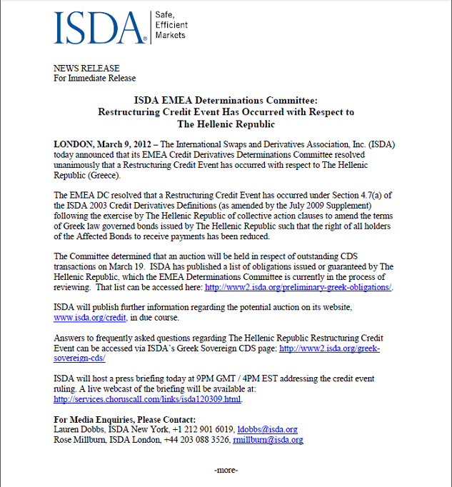Μετά από ανακοίνωση του ISDA, του οργανισμού ελέγχου των CDS, ενεργοποιείται η διαδικασία πληρωμής τους. Δείτε την ανακοίνωση: