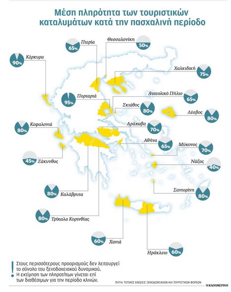 Στον πλέον δημοφιλή προορισμό της χώρας για την πασχαλινή περίοδο, που είναι η Κέρκυρα, η μέση πληρότητα των ξενοδοχείων φθάνει στο 90%, αναφέρει στην «Καθημερινή» ο πρόεδρος του συνδέσμου των ταξιδιωτικών πρακτόρων του νησιού, Δημήτρης Διαβάτης. Στην Πορταριά και στο Βόλο, οι πληρότητες κινούνται σε πολύ υψηλά επίπεδα, της τάξης του 95%, επισημαίνει ο πρόεδρος της Ενωσης Ξενοδόχων Μαγνησίας, Γιώργος Ζαφείρης, συμπληρώνοντας ότι για το τριήμερο οι τιμές κυμαίνονται από 60 έως 90 ευρώ ανά διανυκτέρευση. Στη Μύκονο, η μέση πληρότητα των μονάδων που έχουν ανοίξει, κυρίως στην πόλη, φθάνει στο 70%, τονίζει ο πρόεδρος της ένωσης ξενοδόχων του νησιού, Ανδρέας Φιορεντίνος. Θετικά στην αύξηση της ταξιδιωτική κίνησης λειτουργεί το γεγονός ότι φέτος συμπίπτει το ορθόδοξο με το ρωμαιοκαθολικό Πάσχα και, παράλληλα, με τους Ελληνες τουρίστες, έρχονται από το εξωτερικό, κυρίως, σπουδαστές, καταλήγει ο κ. Φιορεντίνος.