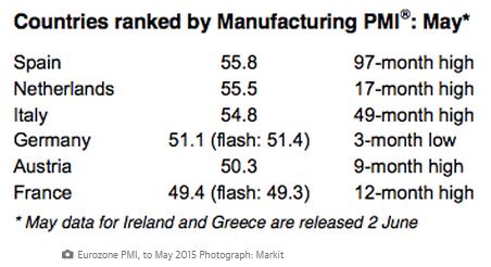 Στην ευρωζώνη συνολικά ο PMI ήταν στο 52,2 το Μάιο, λίγο πάνω από το 52 τον Απρίλιο και ταιριάζει με το νούμερο του Μαρτίου (το οποίο ήταν υψηλό 10 μηνών) αλλά κάτω από το 52,3 που ήταν η προκαταρκτική εκτίμηση πριν δύο εβδομάδες.