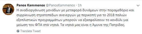 “Η αναδιοργάνωση μονάδων με μεταφορά δυνάμεων στη παραμεθόριο και συρρίκνωση στρατοπέδων ανενεργών με περικοπή για το 2018 παλιών εξοπλιστικών προγραμμάτων μπορούν να εξασφαλίσουν το κονδύλι για μείωση του ΦΠΑ στα νησιά. Τα νησιά μας είναι η ‘Αμυνα της Πατρίδας”.