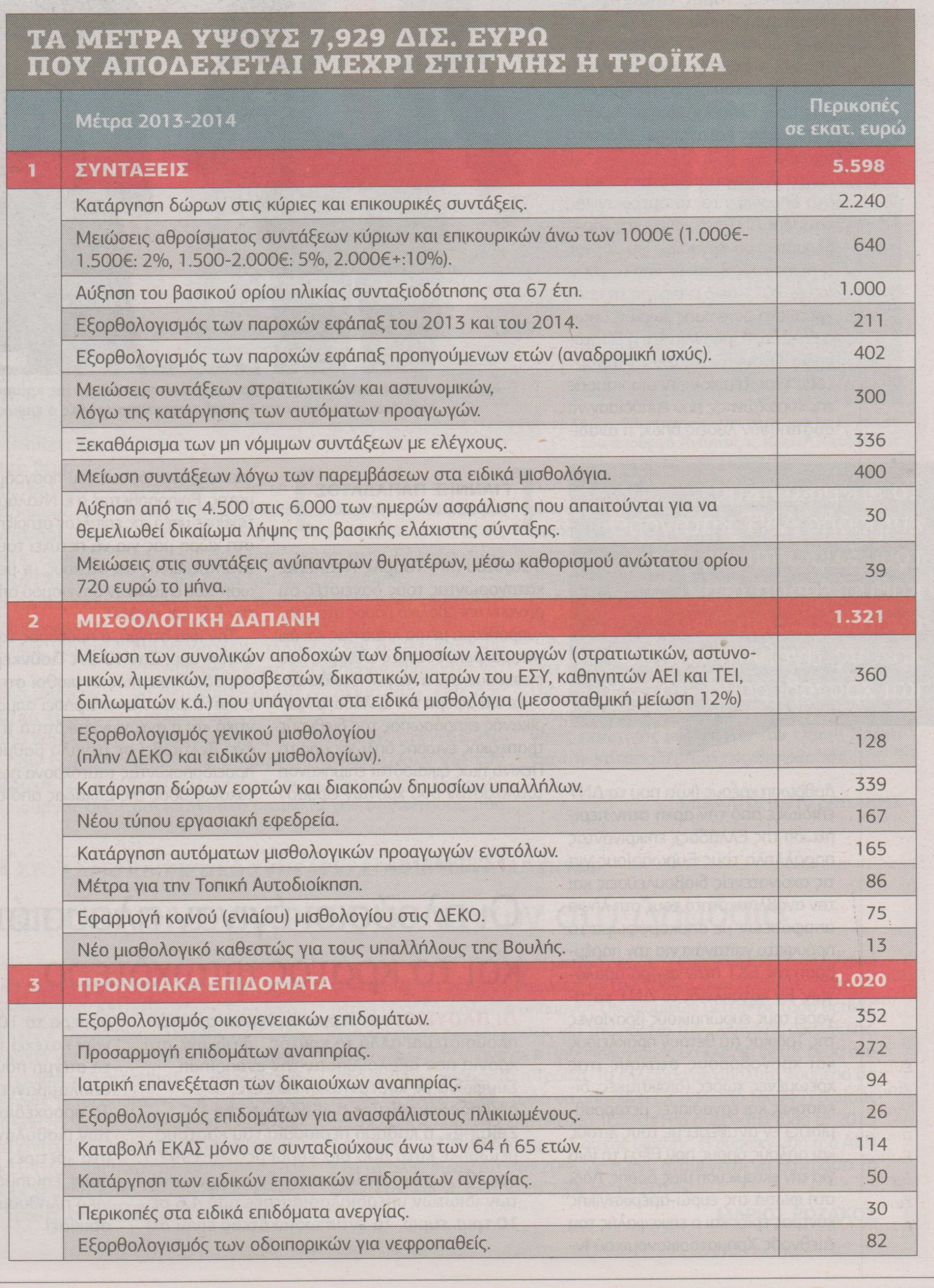 Επιπλέον περικοπές 1 δισ. ευρώ σε μισθούς, κοινωνικά επιδόματα και συντάξεις ζητεί η τρόικα, πιέζοντας για ακόμη πιο επώδυνα μέτρα. Μέχρι στιγμής έχουν συμφωνηθεί περικοπές ύψους 8 δισ. ευρώ, ενώ εξετάζονται περικοπές, στις κατώτατες συντάξεις του ΟΓΑ, σε κοινωνικά επιδόματα και περαιτέρω μειώσεις αποδοχών για δημοσίους υπαλλήλους. ΠΑΤΗΣΤΕ ΕΔΩ ΓΙΑ ΜΕΓΑΛΥΤΕΡΗ ΑΝΑΛΥΣΗ