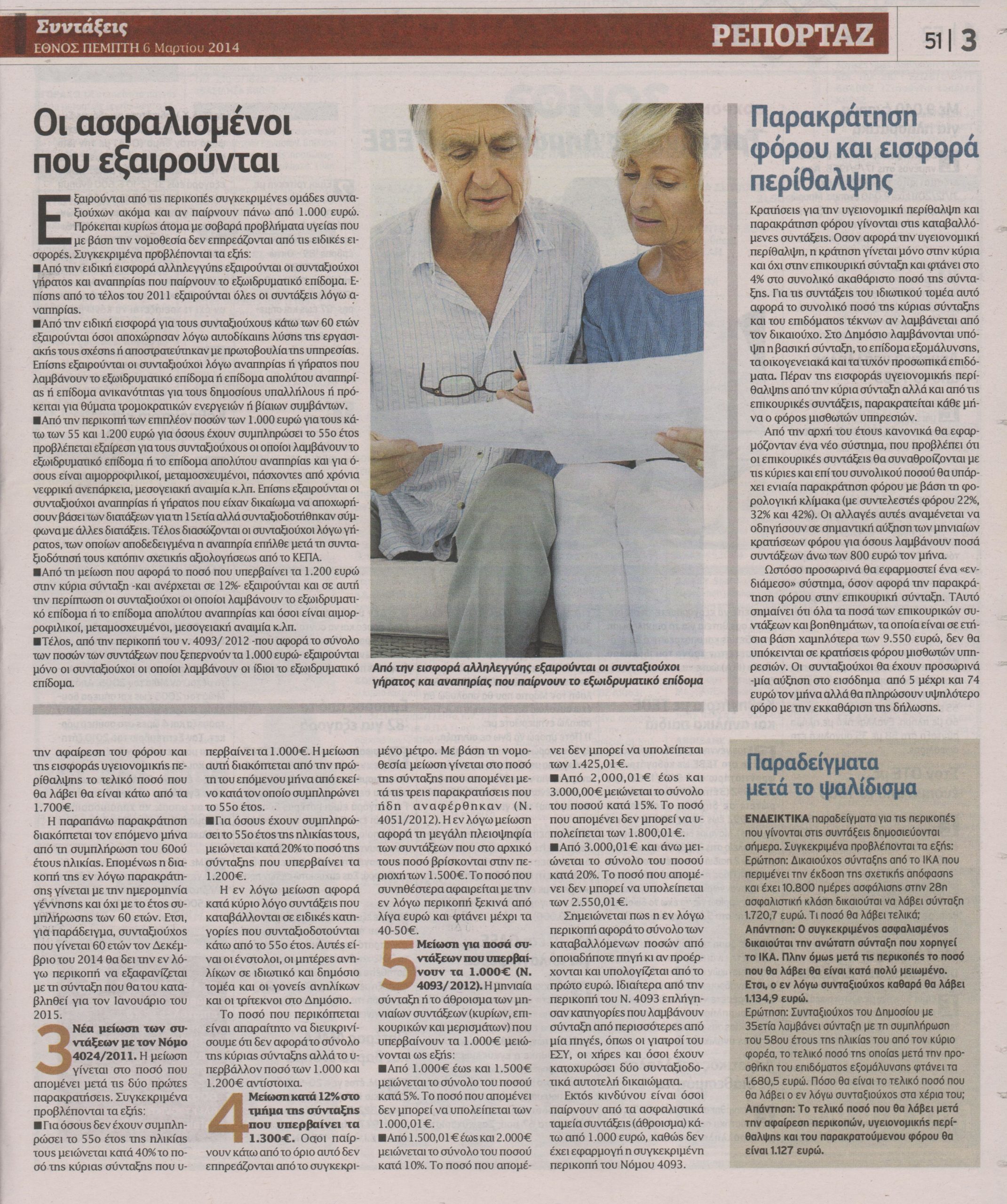 Στον αντίποδα όσοι συνταξιούχοι έχουν περάσει το «φράγμα» των 1.000 ευρώ βλέπουν μια σειρά ειδικών εισφορών -που έχουν επιβληθεί τα τελευταία χρόνια- αλλά και τους φόρους να ροκανίζουν το εισόδημά τους.