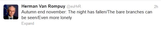 Ενώ βρισκόταν σε εξέλιξη η κρίσιμη συνεδρίαση του Eurogroup, για την Ελλάδα, ο Χέρμαν Βαν Ρομπάι ξεδίπλωνε τις… ποιητικές του ικανότητες μέσω twitter.