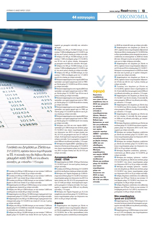 Πρόκειται για δημοσίους υπαλλήλους που είχαν 25 έτη ασφάλισης έως το 2012 και μπορούν να φύγουν με μειωμένη σύνταξη ή συμπληρώνοντας 35ετία, 36ετία ή 37ετία με πλήρη. Ειδικά όρια βρίσκονται σε ισχύ και για μισθωτούς του πρώην ΙΚΑ, των πρώην ευγενών ταμείων ΔΕΚΟ – τραπεζών, για όσους συνταξιοδοτούνται με βαρέα ένσημα, αλλά και για ελεύθερους επαγγελματίες.Διαβάστε εδώ το δημοσίευμα της Realnews