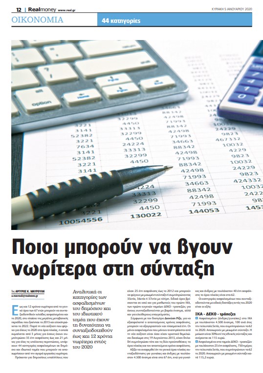 Εως και 12 χρόνια νωρίτερα από το γενικό όριο των 67 ετών μπορούν να συνταξιοδοτηθούν χιλιάδες ασφαλισμένοι και το 2020, στο πλαίσιο της μεγάλης μεταβατικής περιόδου που ξεκίνησε το 2015 και ολοκληρώνεται το 2022. Παρά τη νέα αύξηση που φέρνει για όλους το 2020 στα όρια ηλικίας, η οποία κυμαίνεται από 3 μήνες για όσους έχουν συμπληρώσει 35 έτη ασφάλισης έως και 21 μήνες για όλες τις υπόλοιπες περιπτώσεις, υπάρχουν 44 κατηγορίες ασφαλισμένων σε δημόσιο και ιδιωτικό τομέα που μπορούν να αποχωρήσουν από την αγορά εργασίας νωρίτερα. Τα γενικά όρια ηλικίας συνταξιοδότησης για γυναίκες και άνδρες με τουλάχιστον 4.500 ένσημα είναι στα 67 έτη, ενώ για γυναίκες και άνδρες με τουλάχιστον 40 έτη ασφάλισης το όριο ηλικίας είναι στα 62.