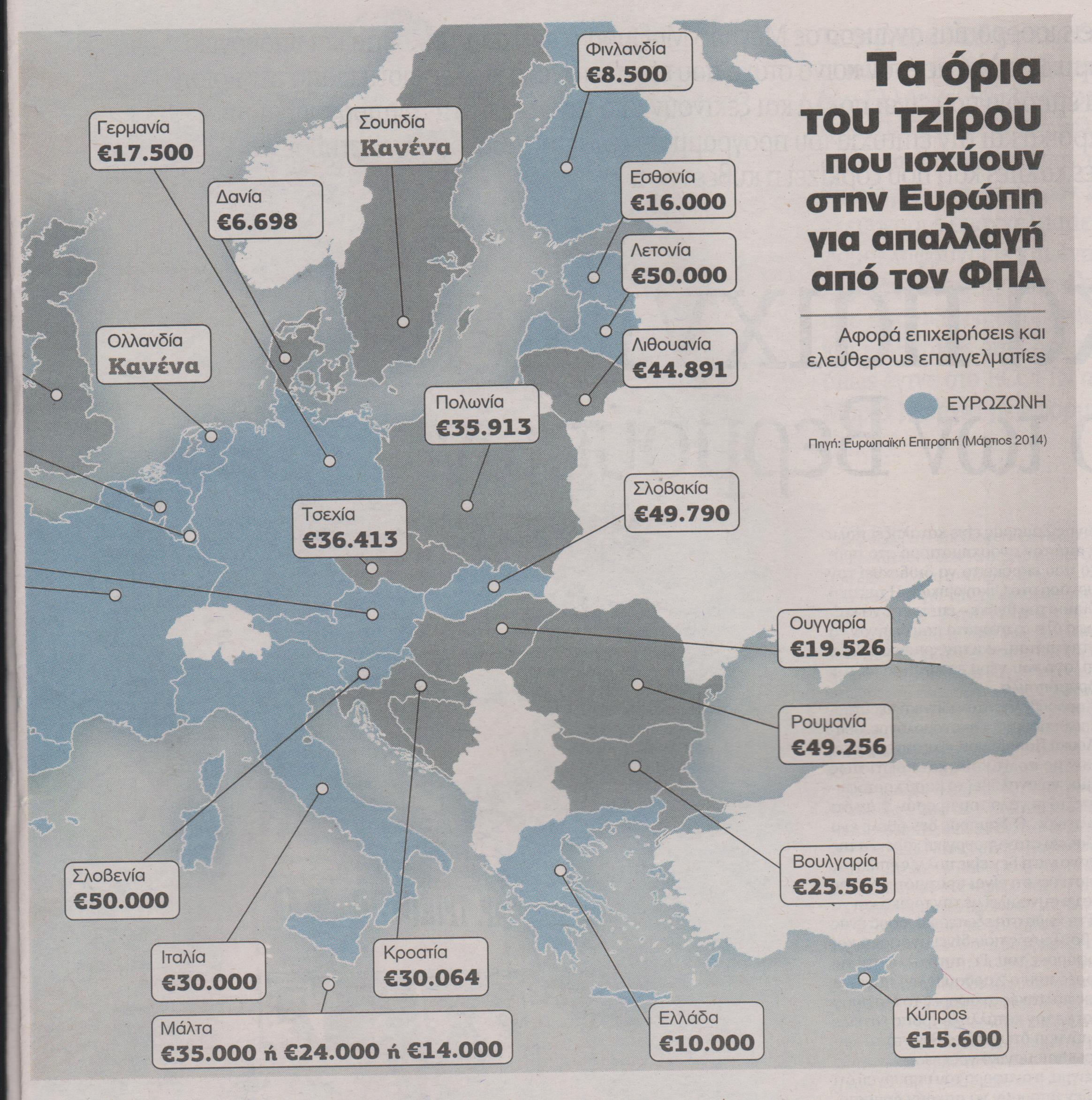 Στην Ελλάδα, από την 1η Ιανουαρίου του επόμενου έτους, 420.000 ελεύθεροι επαγγελματίες, ιδιοκτήτες μικρών επιχειρήσεων και αμειβόμενοι με μπλοκάκια, οι οποίοι σήμερα ταλαιπωρούνται από την υποχρέωση υποβολής δηλώσεων ΦΠΑ κάθε τρίμηνο, θα έχουν τη δυνατότητα να εξαιρεθούν από το σύστημα, υπό την προϋπόθεση ότι ο τζίρος τους εφέτος δεν ξεπερνά τα 10.000 ευρώ. Και επειδή στην Ελλάδα η φοροδιαφυγή συνεχίζει να ανθεί, οι έλεγχοι που θα συνοδεύσουν την εφαρμογή του μέτρου προαναγγέλλεται ήδη πως θα είναι εντατικοί.