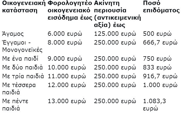 Σημειώνεται ότι το εισοδηματικό όριο αναμένεται να αυξάνεται κατά 1.000 ευρώ για τις οικογένειες με προστατευόμενο μέλος ΑΜεΑ.