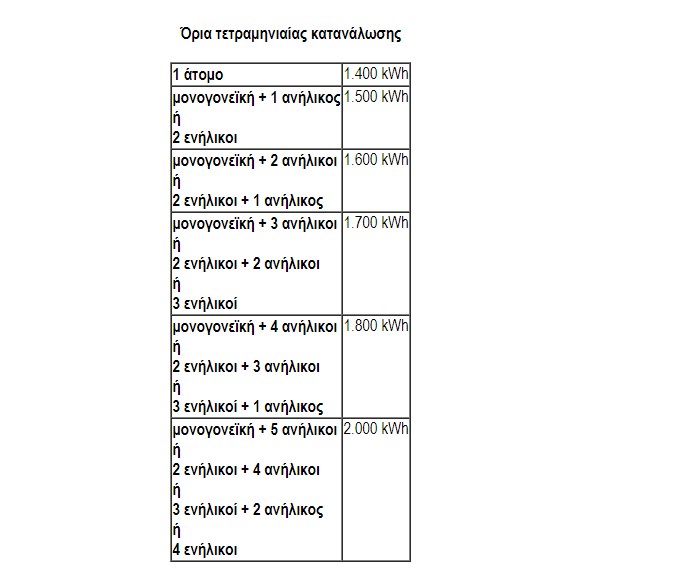 Η επιδοτούμενη κατανάλωση θα εξαρτάται από την σύνθεση του νοικοκυριού (βλέπε τον σχετικό πίνακα), ενώ καταργείται η απένταξη σε περιπτώσεις υπέρβασης της μέγιστης κατανάλωσης μέχρι 10%.