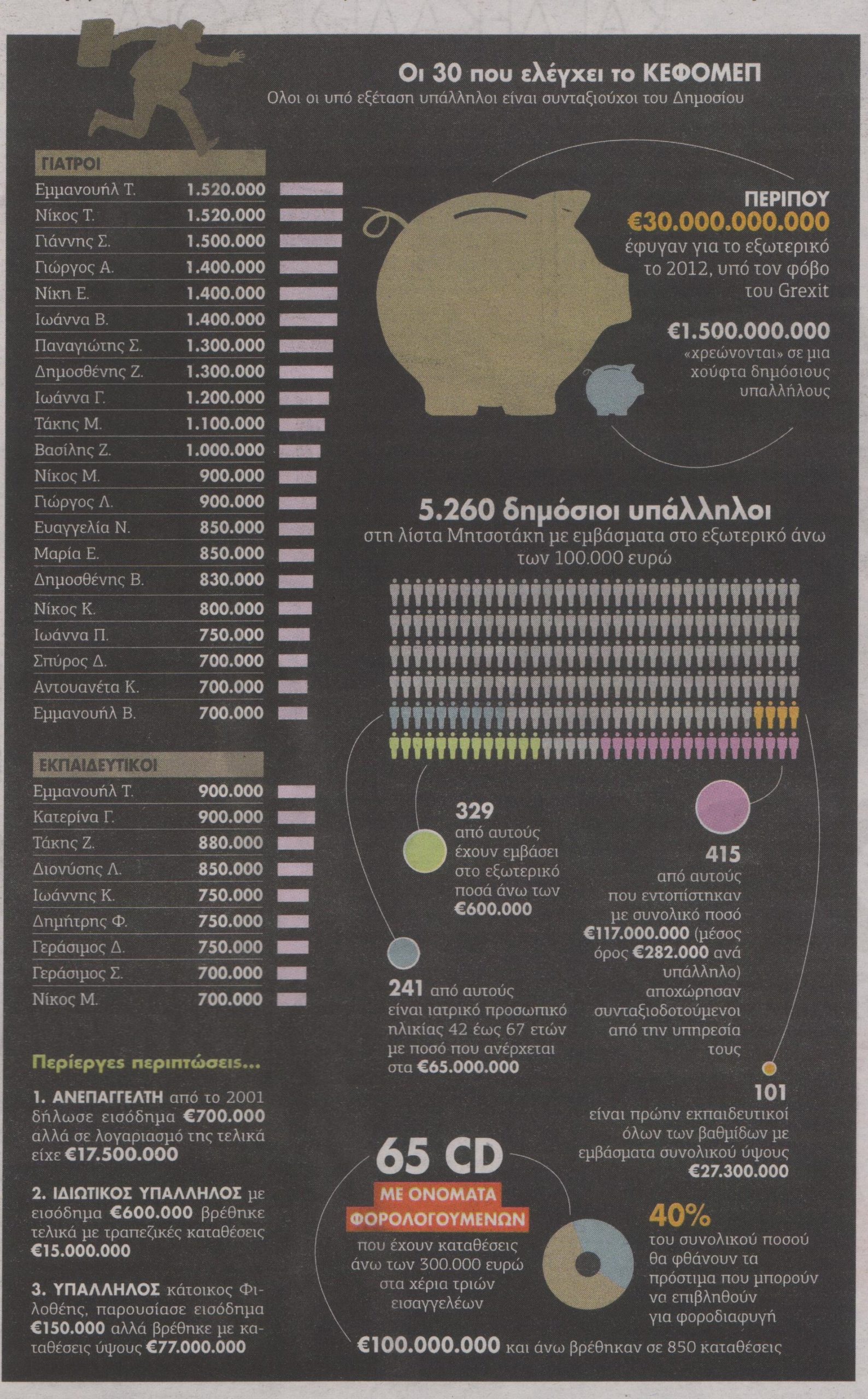 Το 2012, την περίοδο που υπήρχε έντονη φημολογία περί εξόδου της χώρας από το ευρώ, μια «χούφτα» δημόσιοι υπάλληλοι αποφάσισαν να βγάλουν σε τράπεζες του εξωτερικού πάνω από 1,5 δισ. ευρώ. Στην πλειονότητά τους ήταν γιατροί του ΕΣΥ και εκπαιδευτικοί, όπως αναφέρει η εφημερίδα Παραπολιτικά.