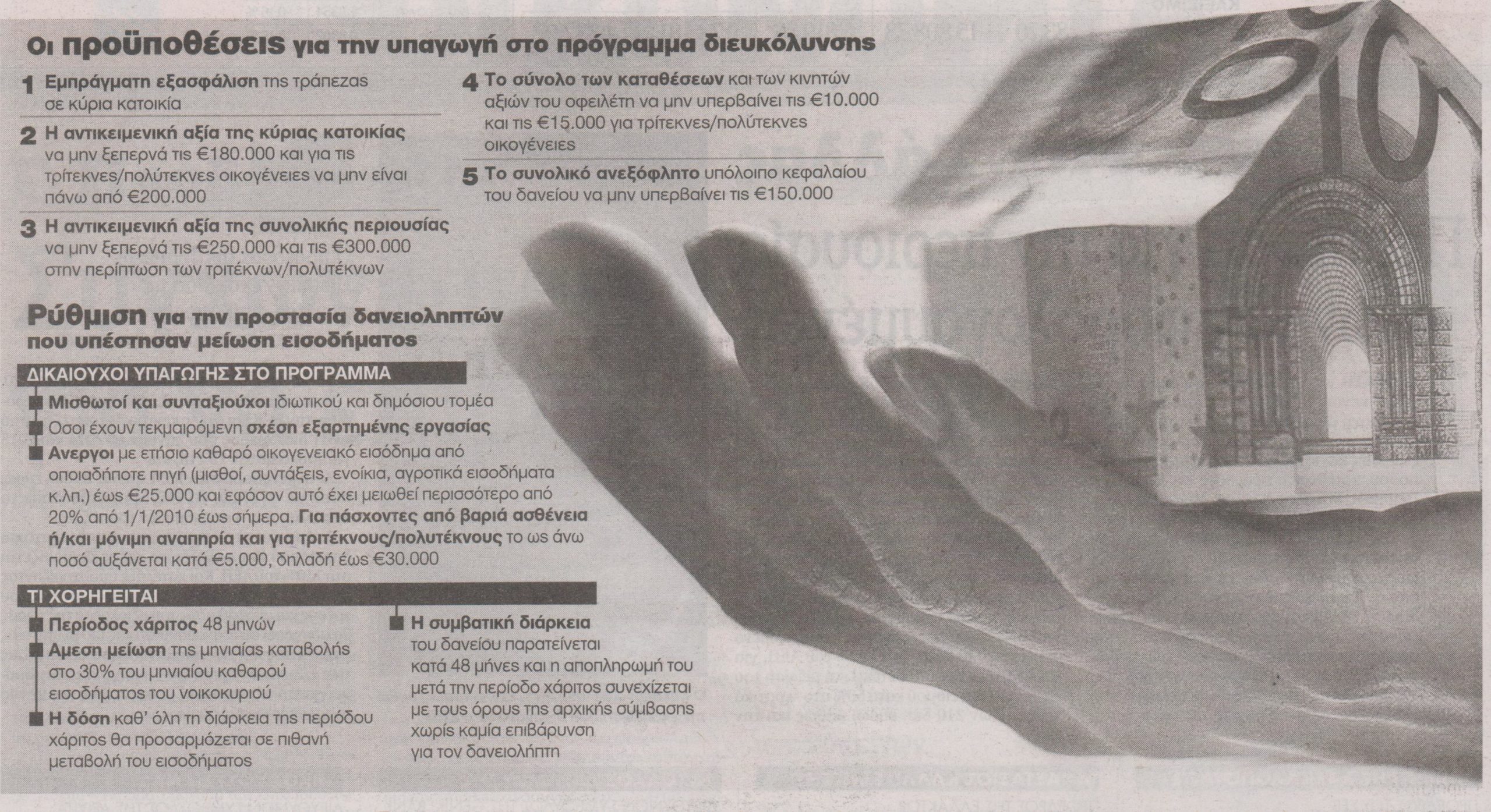 Στο πρόγραμμα διευκόλυνσης μπορούν να υπαχθούν ενήμεροι δανειολήπτες που έχουν μείωση των εισοδημάτων τους μεγαλύτερη από 20% (τα τρέχοντα εισοδήματα σε σύγκριση με αυτά του 2009) και το καθαρό οικογενειακό τους εισόδημα είναι χαμηλότερο από 25.000 ευρώ , ώστε να έχουν 48μηνη περίοδο χάριτος από τις τράπεζες κατά τη διάρκεια της οποίας θα πληρώνουν χαμηλότερη δόση.