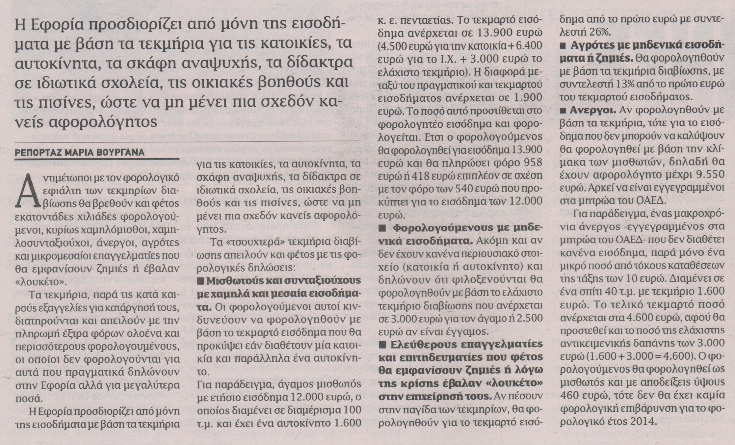 Αντιμέτωποι με τον φορολογικό εφιάλτη των τεκμηρίων διαβίωσης θα βρεθούν και φέτος εκατοντάδες χιλιάδες φορολογούμενοι, κυρίως χαμηλόμισθοι, χαμηλοσυνταξιούχοι, άνεργοι, αγρότες και μικρομεσαίοι επαγγελματίες που θα εμφανίσουν ζημιές ή έβαλαν «λουκέτο».