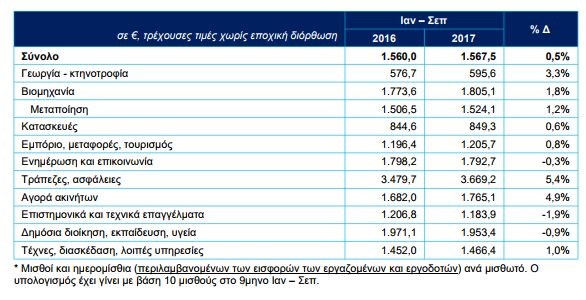 Ο μέσος μηνιαίος μισθός (μαζί με τις εισφορές των εργαζομένων) διαμορφώνεται στο εννεάμηνο του 2017 σε 1.184 ευρώ (+0,5 % από πέρυσι) και μαζί με τις εισφορές των εργοδοτών, σε 1.567 ευρώ. Στη βιομηχανία, ο μηνιαίος μισθός, διαμορφώνεται σε 1.476 ευρώ (+1,7% από πέρυσι), στο εμπόριο, μεταφορές, τουρισμό σε 978 (+0,7% από πέρυσι), στην ενημέρωση και επικοινωνία σε 1.218 (-0,5% από πέρυσι), και στη Δημόσια Διοίκηση, εκπαίδευση, υγεία σε 1.342 ευρώ (-0,9% από πέρυσι).