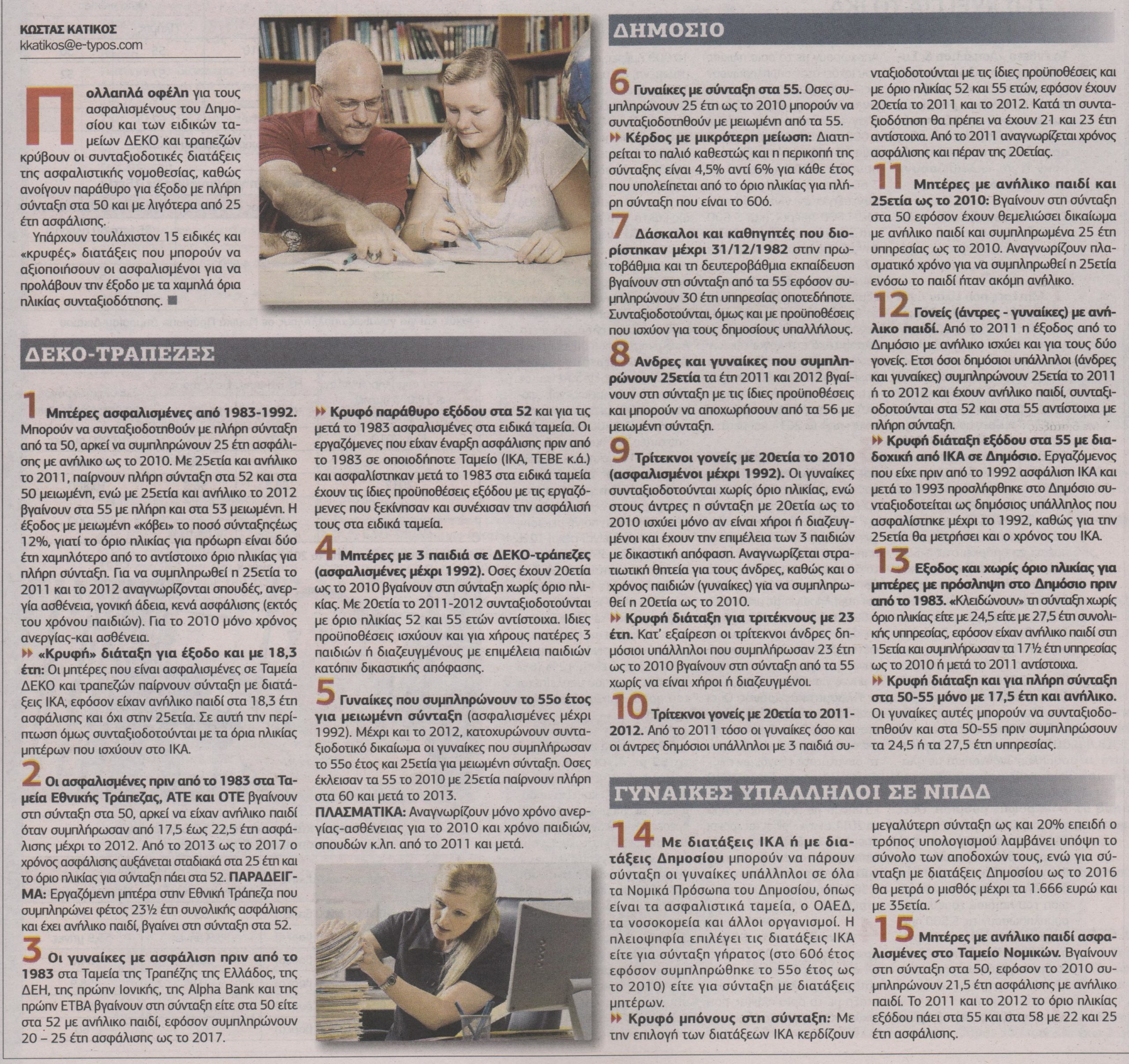 Πολλαπλά οφέλη για τους ασφαλισμένους του Δημοσίου και των ειδικών ταμείων ΔΕΚΟ και τραπεζών κρύβουν οι συνταξιοδοτικές διατάξεις της ασφαλιστικής νομοθεσίας, καθώς ανοίγουν παράθυρο για έξοδο με πλήρη σύνταξη στα 50 και με λιγότερα από 25 έτη ασφάλισης.