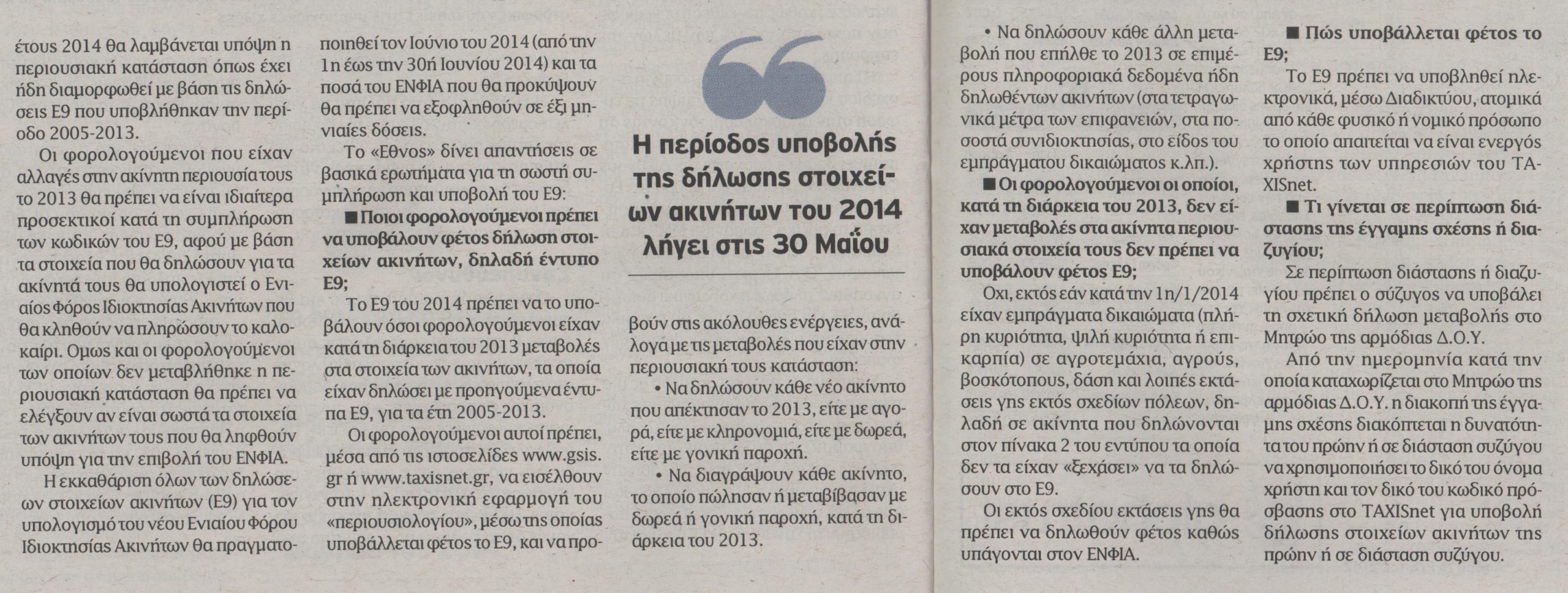 Για τους φορολογούμενους που δεν είχαν μεταβολές στα ακίνητα περιουσιακά στοιχεία τους το 2013, ως δήλωση στοιχείων ακινήτων (Ε9) του έτους 2014 θα λαμβάνει υπόψη η περιουσιακή κατάσταση όπως έχει ήδη διαμορφωθεί με βάση τις δηλώσεις Ε9 που υποβλήθηκαν την περίοδο 2005-2013.