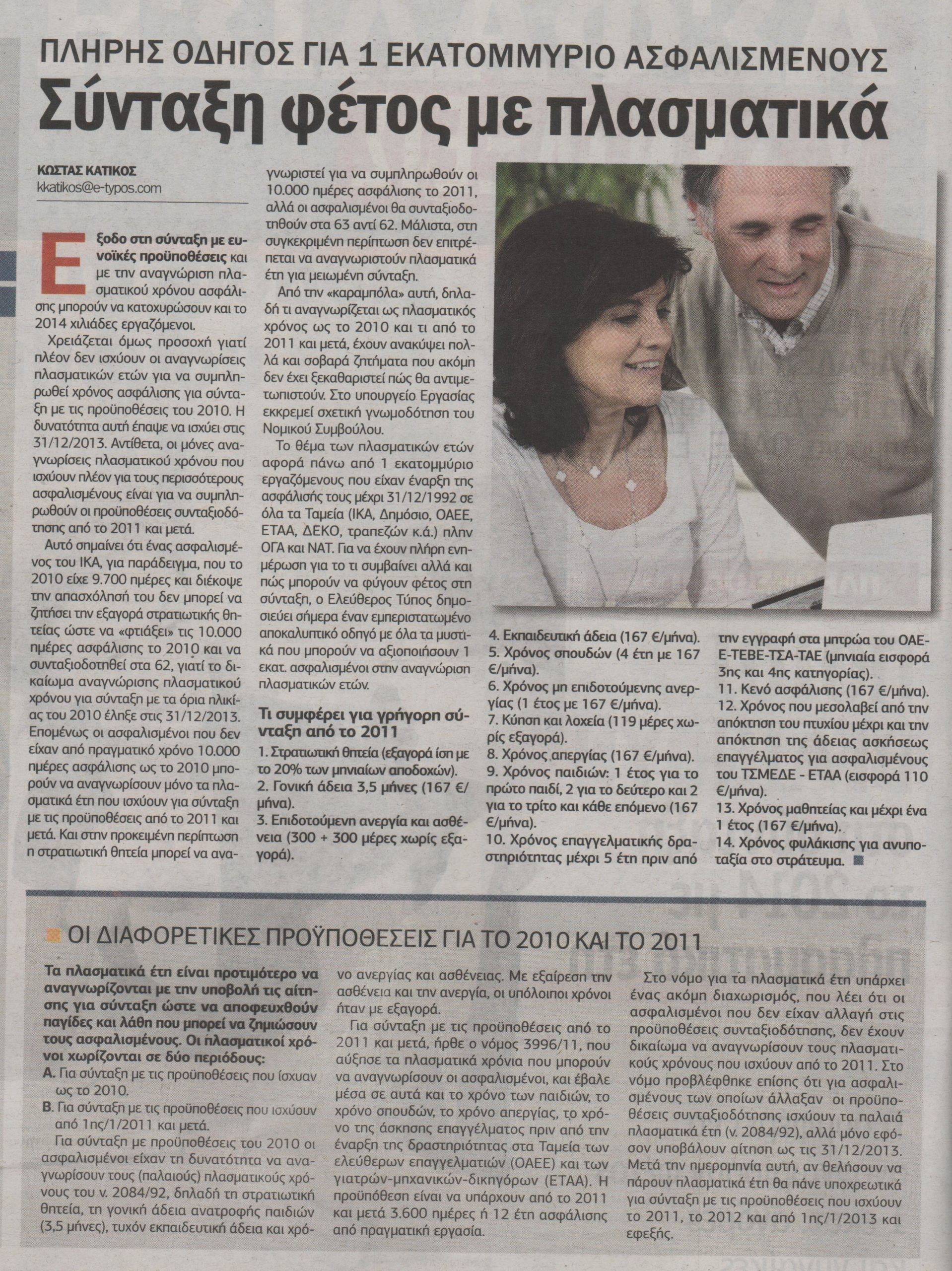 Έξοδο στη σύνταξη με ευνοϊκές προϋποθέσεις και με την αναγνώριση πλασματικού χρόνου ασφάλισης μπορούν να κατοχυρώσουν και το 2014 χιλιάδες εργαζόμενοι.