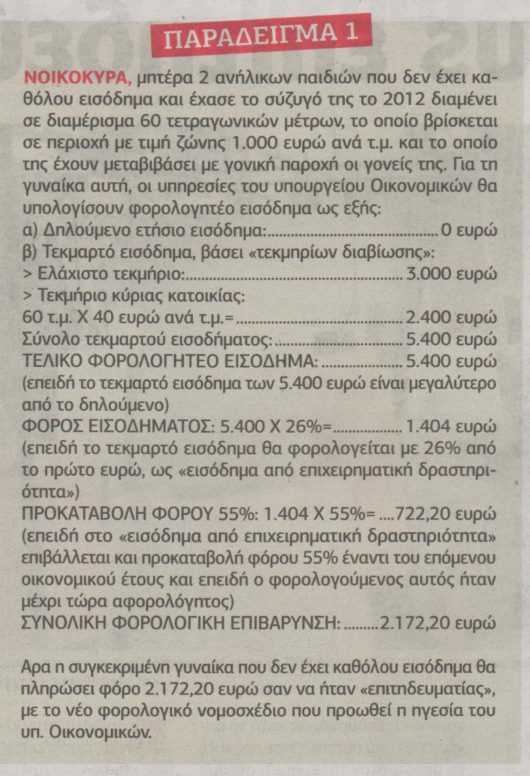 Ένας φορολογούμενος με ετήσιο εισόδημα 26.000 ευρώ και 9.000 ευρώ από ενοίκια δηλαδή συνολικά 35.000 ευρώ πλήρωνε μέχρι σήμερα φόρο 3.150 ευρώ με το νέο σύστημα και τον συντελεστή θα κληθεί να καταβάλει μόλις 900 ευρώ.