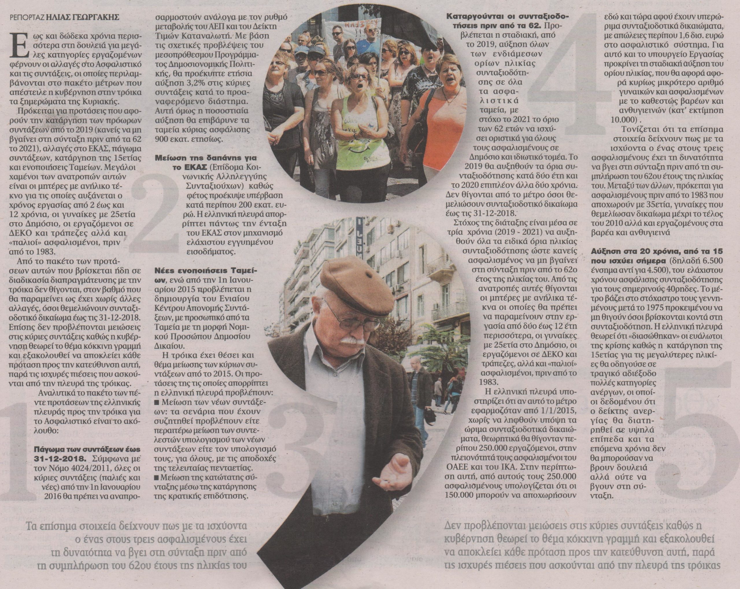 Πρόκειται για προτάσεις που αφορούν στην κατάργηση των πρόωρων συντάξεων από το 2019 (κανείς να μη βγαίνει στη σύνταξη πριν από τα 62 το 2021), αλλαγές στο ΕΚΑΣ, πάγωμα συντάξεων, κατάργηση της 15ετίας και ενοποιήσεις Ταμείων. Μεγάλοι χαμένοι των ανατροπών αυτών είναι οι μητέρες με ανήλικο τέκνο για τις οποίες αυξάνεται ο χρόνος εργασίας από 2 έως και 12 χρόνια, οι γυναίκες με 25ετία στο Δημόσιο, οι εργαζόμενοι σε ΔΕΚΟ και τράπεζες αλλά και «παλιοί» ασφαλισμένοι, πριν από το 1983.