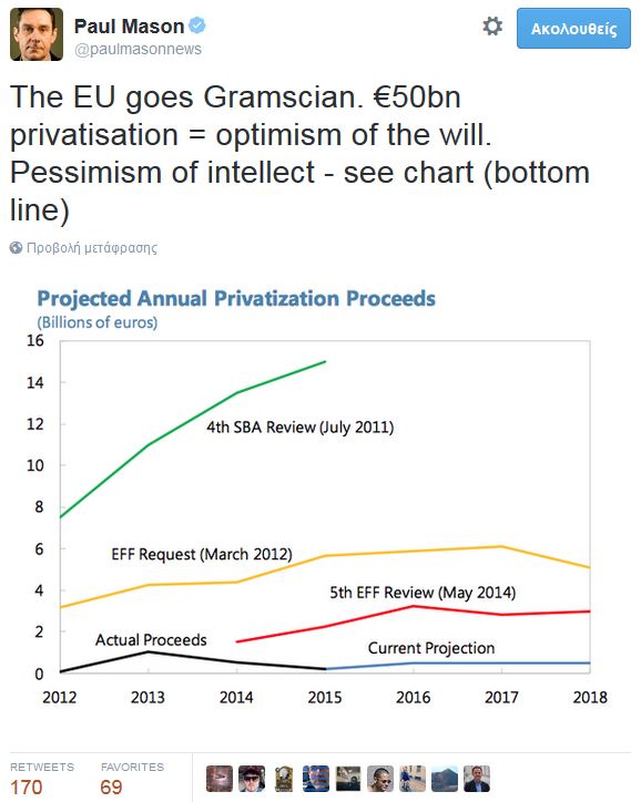 Πού κατέληξαν οι προηγούμενοι φιλόδοξοι στόχοι ιδιωτικοποιήσεων δείχνει με μια εικόνα στο twitter o Πολ Μέισον δημοσιογράφος στο Channel 4.