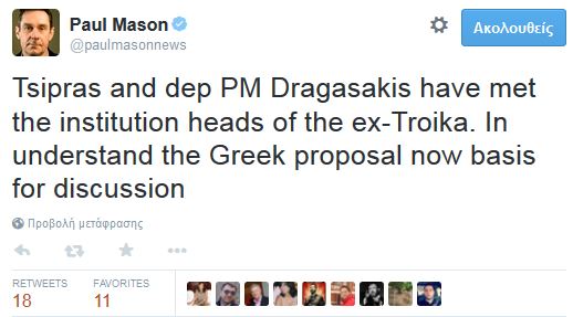 «Τσίπρας και Δραγασάκης έχουν συναντηθεί με τους επικεφαλής των θεσμών, της πρώην τρόικας. Οι ελληνικές προτάσεις θεωρούνται τώρα βάση για συζήτηση», γράφει το tweet.