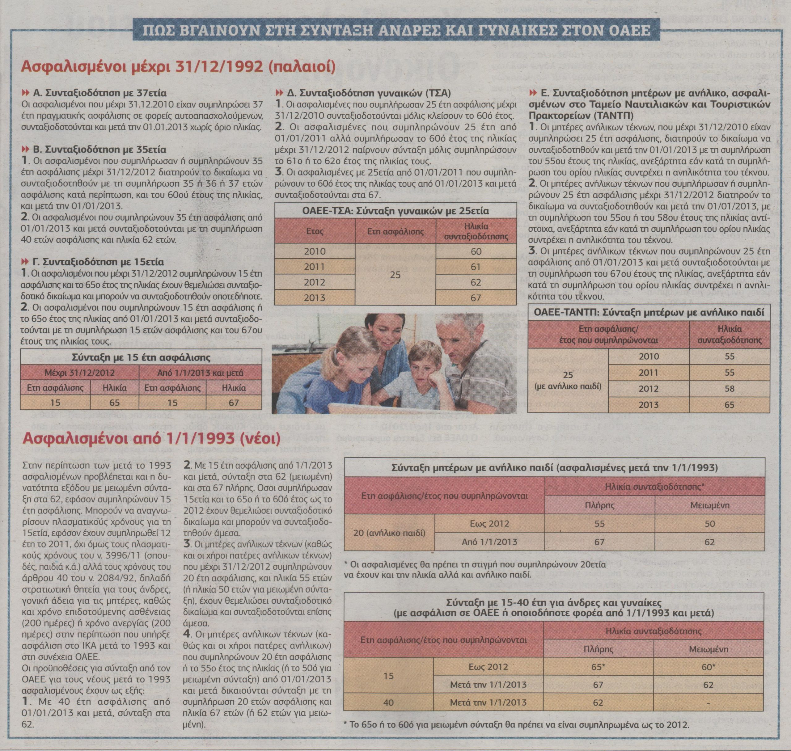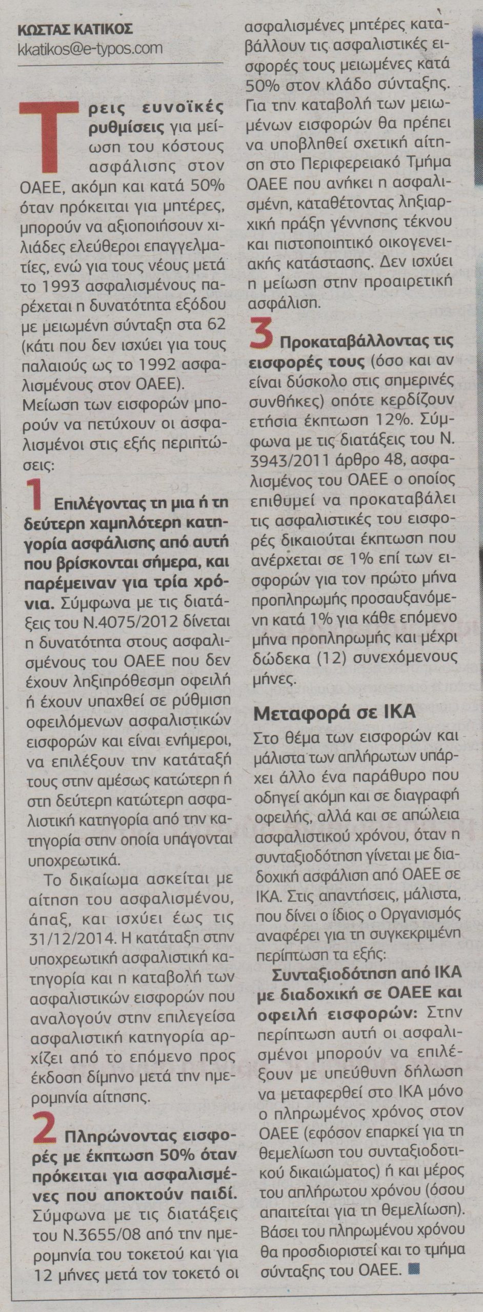 Τρεις ευνοϊκές ρυθμίσεις για μείωση του κόστους ασφάλισης στον ΟΑΕΕ, ακόμη και κατά 50% όταν πρόκειται για μητέρες, μπορούν να αξιοποιήσουν χιλιάδες ελεύθεροι επαγγελματίες, ενώ για τους νέους μετά το 1993 ασφαλισμένους παρέχεται η δυνατότητα εξόδου με μειωμένη σύνταξη στα 62 (κάτι που δεν ισχύει για τους παλαιούς ως το 1992 ασφαλισμένους στον ΟΑΕΕ.