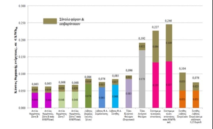 Όπως αναφέρει χαρακτηριστικά, «τα τελευταία χρόνια διαβάζουμε και ακούμε συχνά για τρόπους εξοικονόμησης ενέργειας στην θέρμανση των κατοικιών, η οποία μπορεί να πραγματοποιηθεί με αρκετά διαφορετικά συστήματα. Κάθε σύστημα έχει τα πλεονεκτήματα και τα μειονεκτήματά του, αλλά βασικό κριτήριο κατά την σύγκρισή τους είναι το ετήσιο κόστος καθενός από αυτά, εξασφαλίζοντας όμως πλήρως τις συνθήκες θερμικής άνεσης για τον χρήστη. Θερμική άνεση είναι ο βαθμός ικανοποίησης στην αντίληψη των ανθρώπων σχετικά με τις συνθήκες που βιώνουν στο θερμικό τους περιβάλλον. Είναι δηλαδή ένας δείκτης που εκφράζει το πόσο καλά νοιώθει κάποιος βρισκόμενος σε ένα δεδομένο θερμικό περιβάλλον και πόσο ικανοποιημένος είναι από αυτό ώστε να μην επιθυμεί την αλλαγή του. Βασική συνθήκη επίτευξης θερμικής άνεσης είναι να διατηρείται μια σταθερή θερμοκρασία (με μικρές μεταβολές) κατά την διάρκεια της χειμερινής περιόδου εντός της κατοικίας, καθώς επίσης η ποιότητα του αέρα και η σχετική υγρασία του χώρου που θερμαίνεται να είναι εντός των ορίων που ορίζει η νομοθεσία για να μην επηρεάζει αρνητικά την υγεία των κατοίκων».Τα κυριότερα συστήματα θέρμανσηςΤα κυριότερα συστήματα θέρμανσης που χρησιμοποιούνται στις κατοικίες είναι τα παρακάτω: – Λέβητες πετρελαίου – Λέβητες φυσικού αερίου – Λέβητες υγραερίου – Λέβητες βιομάζας – Ηλεκτρικός λέβητας – Ηλεκτρική θέρμανση με αντιστάσεις – Τζάκι κλειστού θαλάμου (ενεργειακό) – Τζάκι ανοικτού θαλάμου – Αντλία θερμότητας ‘Όπως τονίζει ο κ. Πάνος «από τα παραπάνω συστήματα τα τρία πρώτα αποτελούν την πλειοψηφία των συστημάτων θέρμανσης στις κατοικίες. Συγκεκριμένα οι λέβητες πετρελαίου χρησιμοποιούνται κυρίως σε κεντρικές θερμάνσεις πολυκατοικιών, ενώ οι λέβητες αερίου συνήθως επιλέγονται για ατομική – αυτόνομη θέρμανση (λέβητες συμπύκνωσης). Οι λέβητες υγραερίου είναι μια λύση όταν υπάρχει διαθέσιμος κατάλληλος χώρος για την εγκατάστασή τους και δεν υπάρχει δίκτυο φυσικού αερίου στην περιοχή. Τα τελευταία χρόνια αυξάνονται σημαντικά και οι εγκαταστάσεις θέρμανσης με αντλίες θερμότητας. Μεγάλη βοήθεια για την διείσδυση του συγκεκριμένου συστήματος θέρμανσης στην ελληνική αγορά έδωσαν και τα προγράμματα ΕΞΟΙΚΟΝΟΜΩ ΚΑΤ’ΟΙΚΟΝ που “τρέχουν” κάθε χρόνο τα τρία τελευταία έτη». Σύμφωνα με τον κ. Πάνο, «με βάση αρκετές σημαντικές μελέτες που έχουν γίνει τα τελευταία χρόνια από αρκετούς φορείς και εταιρείες, σχετικά με την σύγκριση των ανωτέρω συστημάτων θέρμανσης, έχουν προκύψει τα παρακάτω συμπεράσματα για την ετήσια χρήση τους: – Το τζάκι ανοικτού θαλάμου και η ηλεκτρική θέρμανση με αντιστάσεις είναι τα πλέον κοστοβόρα συστήματα θέρμανσης. Σε αυτά θα προσθέσουμε και πολλά ακόμη συστήματα ηλεκτρικής θέρμανσης όπως θέρμανση με κλιματιστικά, θερμοσυσσωρευτές, αερόθερμα κλπ)- Οι λέβητες πετρελαίου και τα ενεργειακά τζάκια είναι επίσης ακριβά σε χρήση αλλά χαμηλότερα σε κατάταξη από τα ανωτέρω. – Ικανοποιητική οικονομία στην θέρμανση επιτυγχάνεται με λέβητες βιομάζας και υγραερίου – Μεγάλη οικονομία πραγματοποιείται με τους λέβητες συμπύκνωσης φυσικού αερίου (ατομικούς) – Μέγιστη οικονομία μπορεί να επιτευχθεί μόνο με τις αντλίες θερμότητας. Στο παρακάτω διάγραμμα που έχει δημοσιεύσει το ΕΘΝΙΚΟ ΜΕΤΣΟΒΙΟ ΠΟΛΥΤΕΧΝΕΙΟ (21.11.2016) φαίνεται ενδεικτικά βάσει συγκεκριμένων δεδομένων η διαφορά κόσ