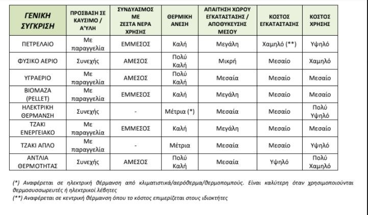 Όπως θα παρατηρήσετε η μέγιστη οικονομία επιτυγχάνεται με το σύστημα της αντλίας θερμότητας, το οποίο όμως είναι και το πιο ακριβό σε κόστος εγκατάστασης από όλα τα υπόλοιπα. Αντίθετα το απλό τζάκι και τα συστήματα με ηλεκτρικές αντιστάσεις είναι τα πιο ενεργοβόρα. Το φυσικό αέριο και το ενεργειακό τζάκι είναι σε κόστος λειτουργίας ανάμεσα από τα παραπάνω συστήματα.Στον παρακάτω πίνακα δίνεται μια ευρύτερη αξιολόγηση των επιμέρους συστημάτων με αρκετά κριτήρια πέραν του κόστους χρήσης: