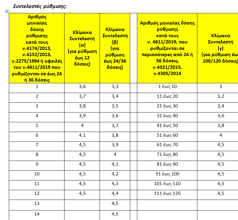 -Οι συντελεστές του πίνακα εφαρμόζονται και για τις ενεργές ρυθμίσεις που έχουν χορηγηθεί πριν από τη δημοσίευση του ν.4611/2019, με τη χρήση του συντελεστή που αντιστοιχεί, κατά περίπτωση, στον αριθμό της τελευταίας μηνιαίας δόσης ρύθμισης που εξοφλήθηκε.