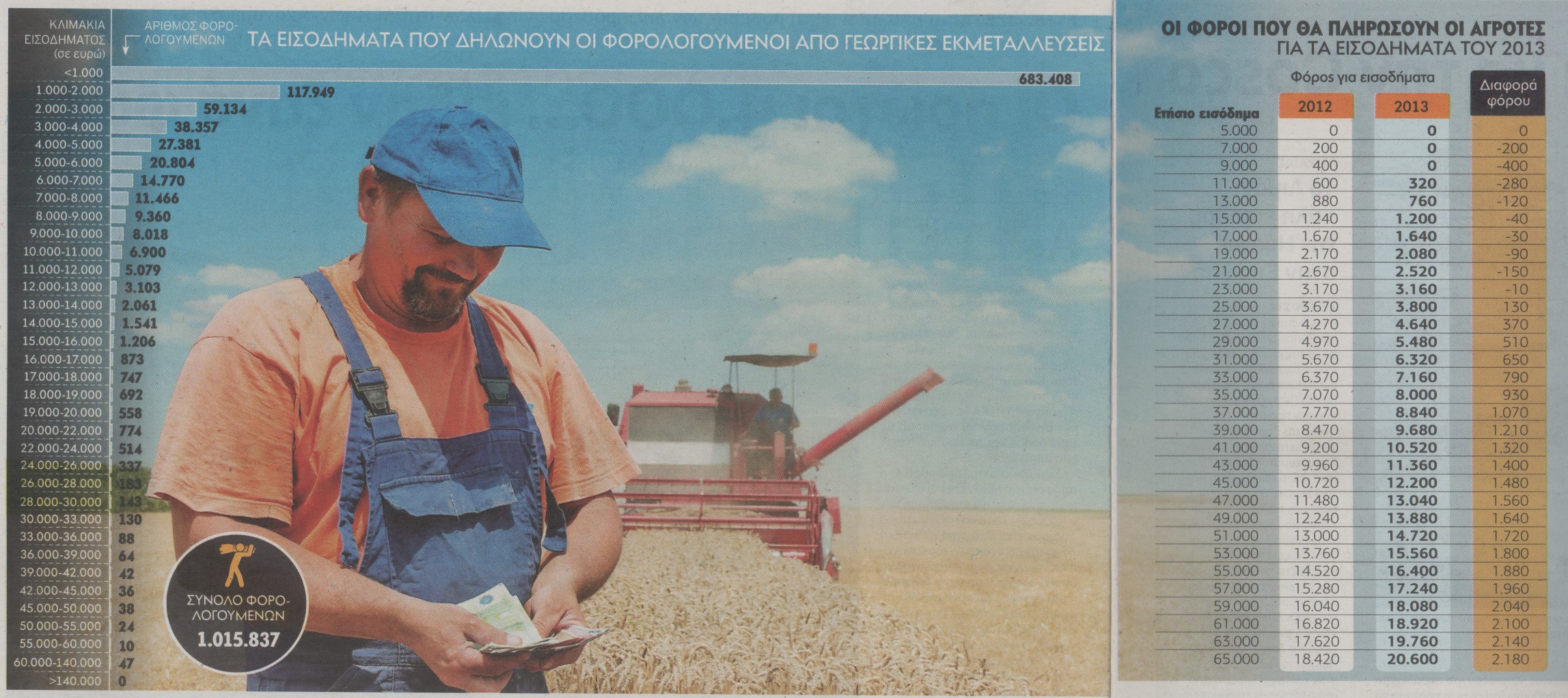 Δηλαδή τα φετινά εισοδήματα των αγροτών θα φορολογηθούν το 2014 με βάση την κλίμακα των μισθωτών και συνταξιούχων, ενώ από την 1η Ιανουαρίου 2014 οι φορολογούμενοι που ασκούν κατά κύριο επάγγελμα αγροτικές δραστηριότητες θα υποχρεωθούν να τηρούν βιβλία εσόδων-εξόδων, όπως ακριβώς ισχύει για τους ελεύθερους επαγγελματίες.