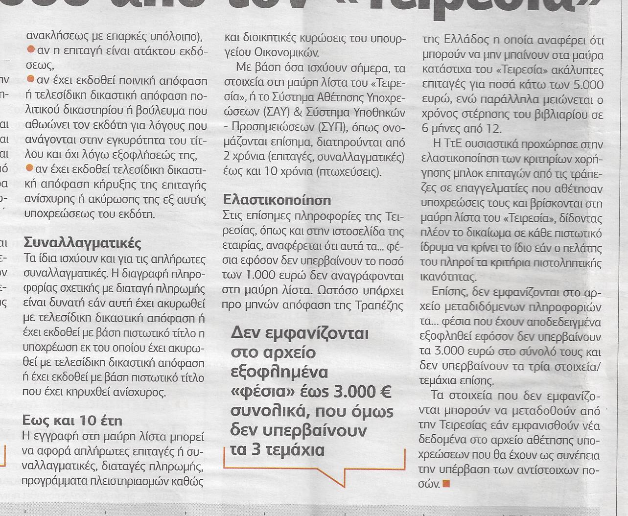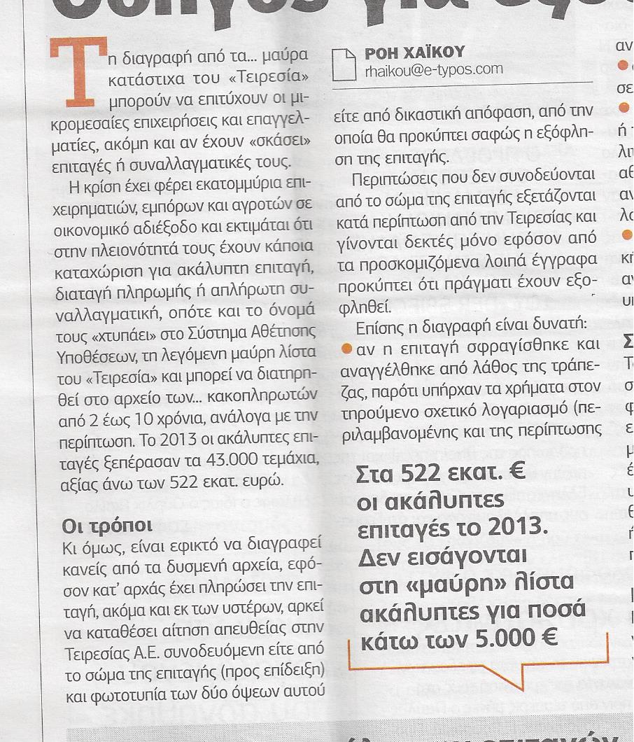 Η κρίση έχει φέρει εκατομμύρια επιχειρηματιών, εμπόρων και αγροτών σε οικονομικό αδιέξοδο και εκτιμάται ότι στην πλειονότητά τους έχουν κάποια καταχώριση για ακάλυπτη επιταγή, διαταγή πληρωμής ή απλήρωτη συναλλαγματική, οπότε και το όνομά τους «χτυπάει» στο Σύστημα Αθέτησης Υποθέσεων, τη λεγόμενη μαύρη λίστα του «Τειρεσία» και μπορεί να διατηρηθεί στο αρχείο των…κακοπληρωτών από 2 έως 10 χρόνια, ανάλογα με την περίπτωση.
