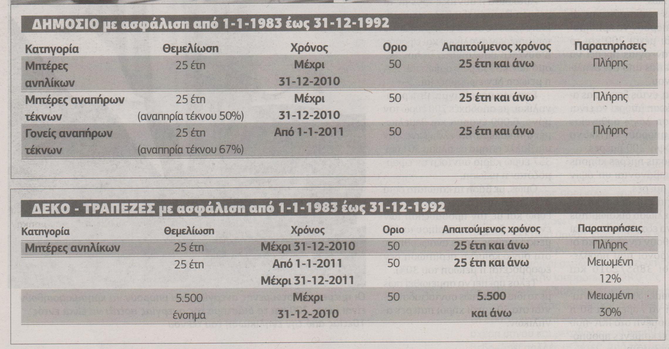 Σημειώνεται πως στις ασφαλισμένες που θεμελίωσαν δικαίωμα μέχρι και το 2010 καταβάλλεται στα 50 πλήρης σύνταξη από το Δημόσιο και τα Ταμεία των ΔΕΚΟ και των τραπεζών. Στο ΙΚΑ καταβάλλεται μειωμένη σύνταξη (καθώς για την πλήρη πρέπει να συμπληρωθεί το 55ο έτος) με το πέναλτι να φτάνει το 30% για όσες ασφαλισμένες ανοίγουν την πόρτα εξόδου στα 50.