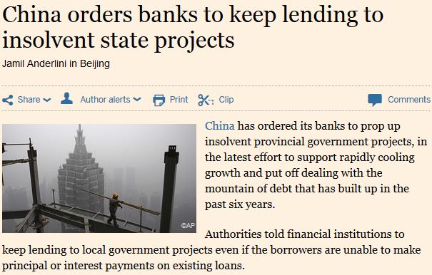 Το Πεκίνο έχει διατάξει τις τράπεζες να στηρίξουν έργα των τοπικών επαρχιακών κυβερνήσεων παρά την αφερεγγυότητά τους, σε μια τελευταία προσπάθεια να στηρίξει την ανάπτυξη η οποία μπαίνει ταχέως στο ψυγείο, στέλνοντας στις ελληνικές καλένδες την αντιμετώπιση του βουνού χρέους που έχει συσσωρευτεί τα τελευταία έξι χρόνια.