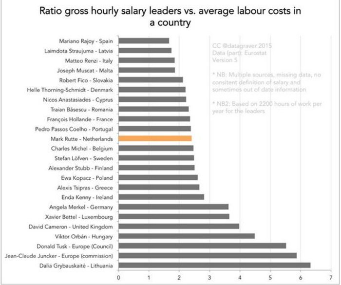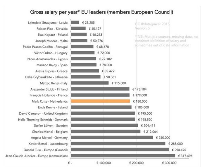 Είναι αξιοσημείωτο ότι πιο ακριβοπληρωμένοι δεν είναι ηγέτες κρατών αλλά οι Ζαν Κλοντ Γιούνκερ, με μισθό ύψους 317.496 ευρώ, και ο Ντόναλντ Τουσκ, του οποίου η αμοιβή φτάνει τις 298.495 ευρώ. Ο μισθός της Γερμανίδας Καγκελαρίου, Άνγκελα Μέρκελ, ανέρχεται στις 250.000 ευρώ, ενώ του Φρανσουά Ολάντ στις 179.000 ευρώ.